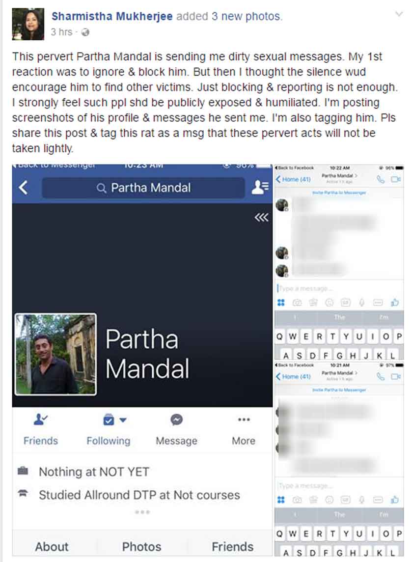 शर्मिष्ठा ने फेसबुक पर लिखा है, ‘पार्थ मंडल नाम का सनकी मुझे अश्लील मेसेज भेज रहा है. पहले मैंने सोचा कि इसे नजरअंदाज कर दूं लेकिन फिर मैंने सोचा कि अगर मैं खामोश रह गई तो वो दूसरे लोगों के साथ भी ऐसा करेगा इसलिए सिर्फ उसे ब्लॉक करना ही काफी नहीं.